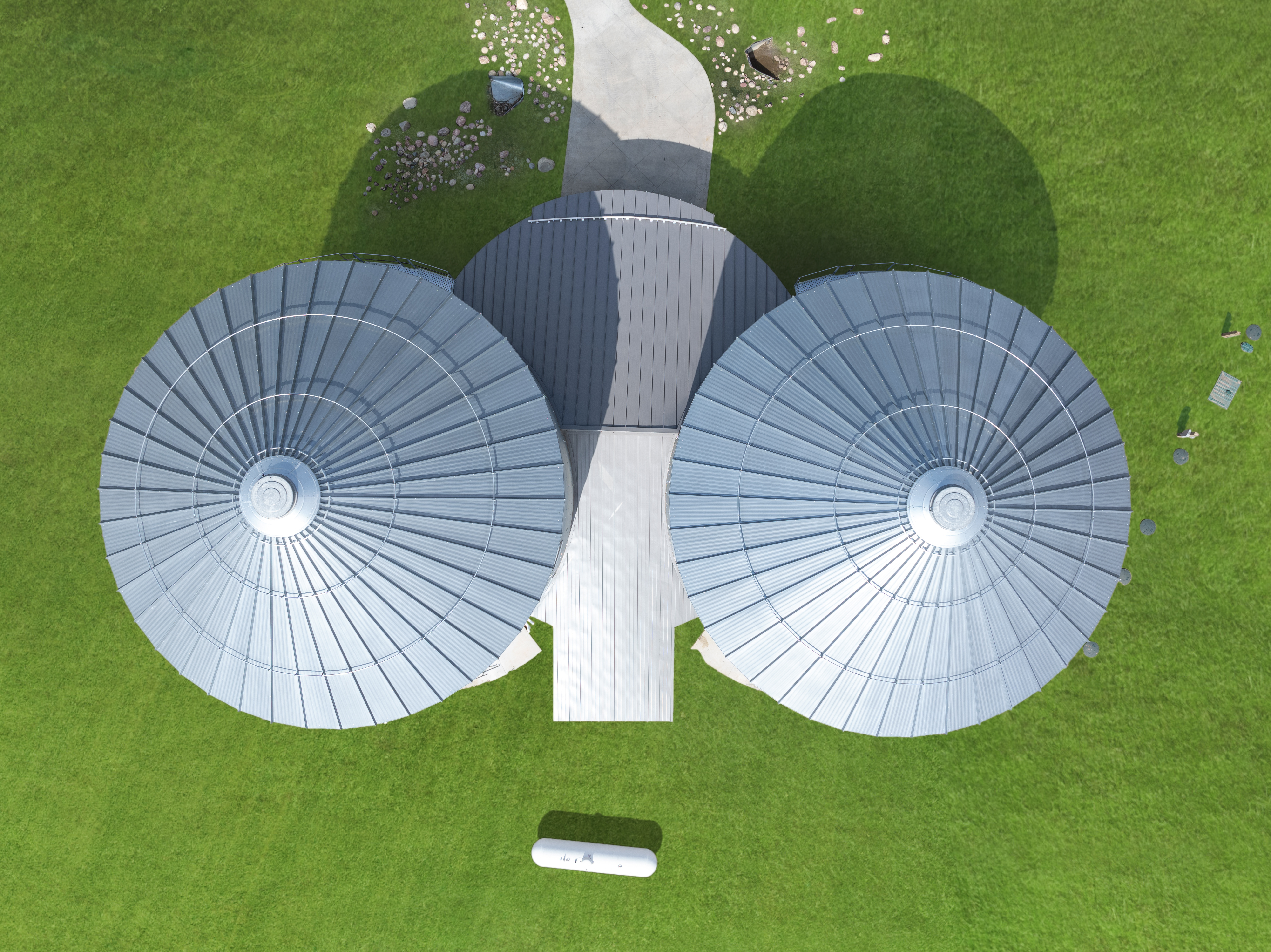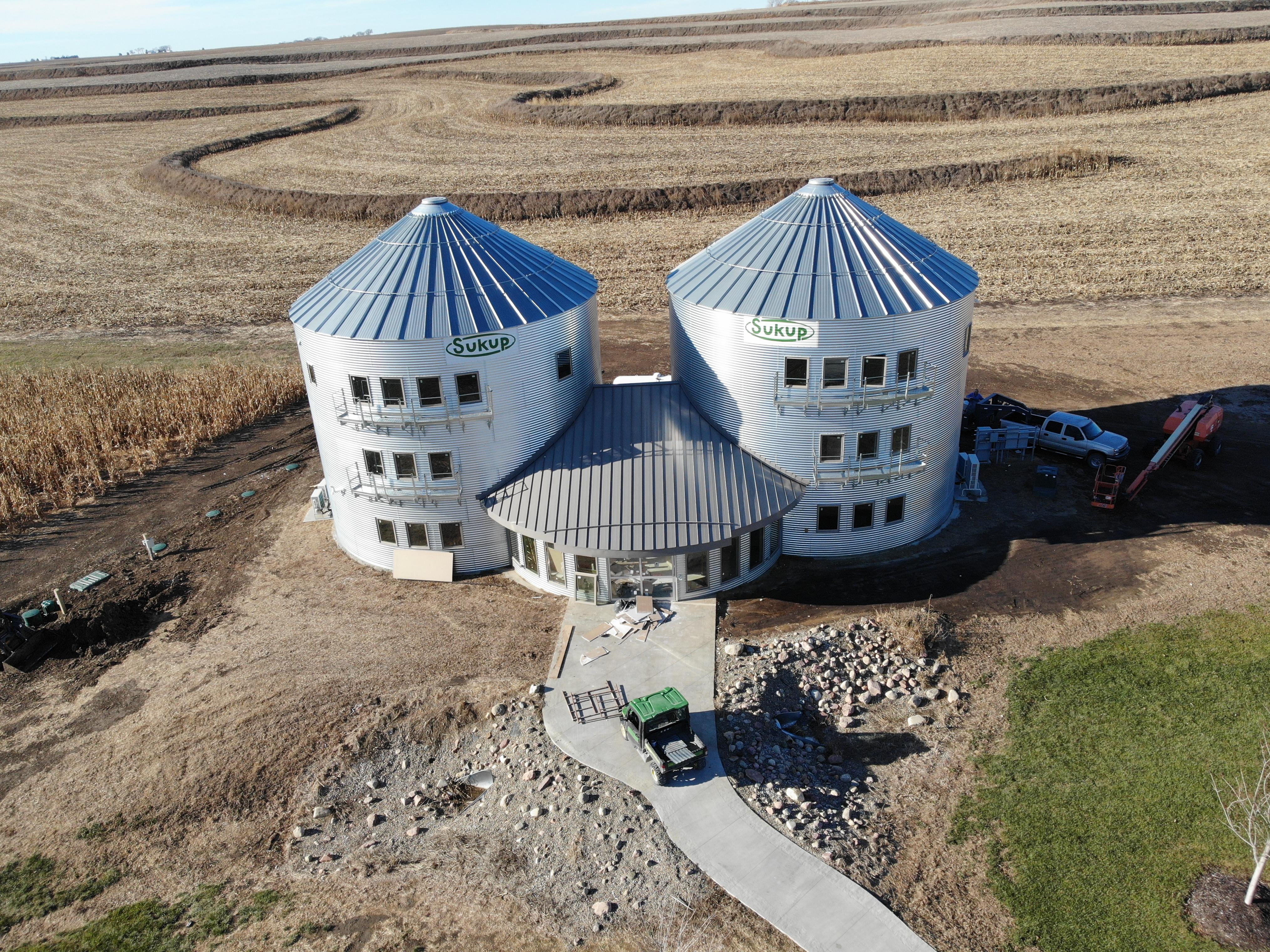 The vision of Penny's Landing came to life, featuring two Sukup Non-Stiffened Farm Bins connected with a common area.